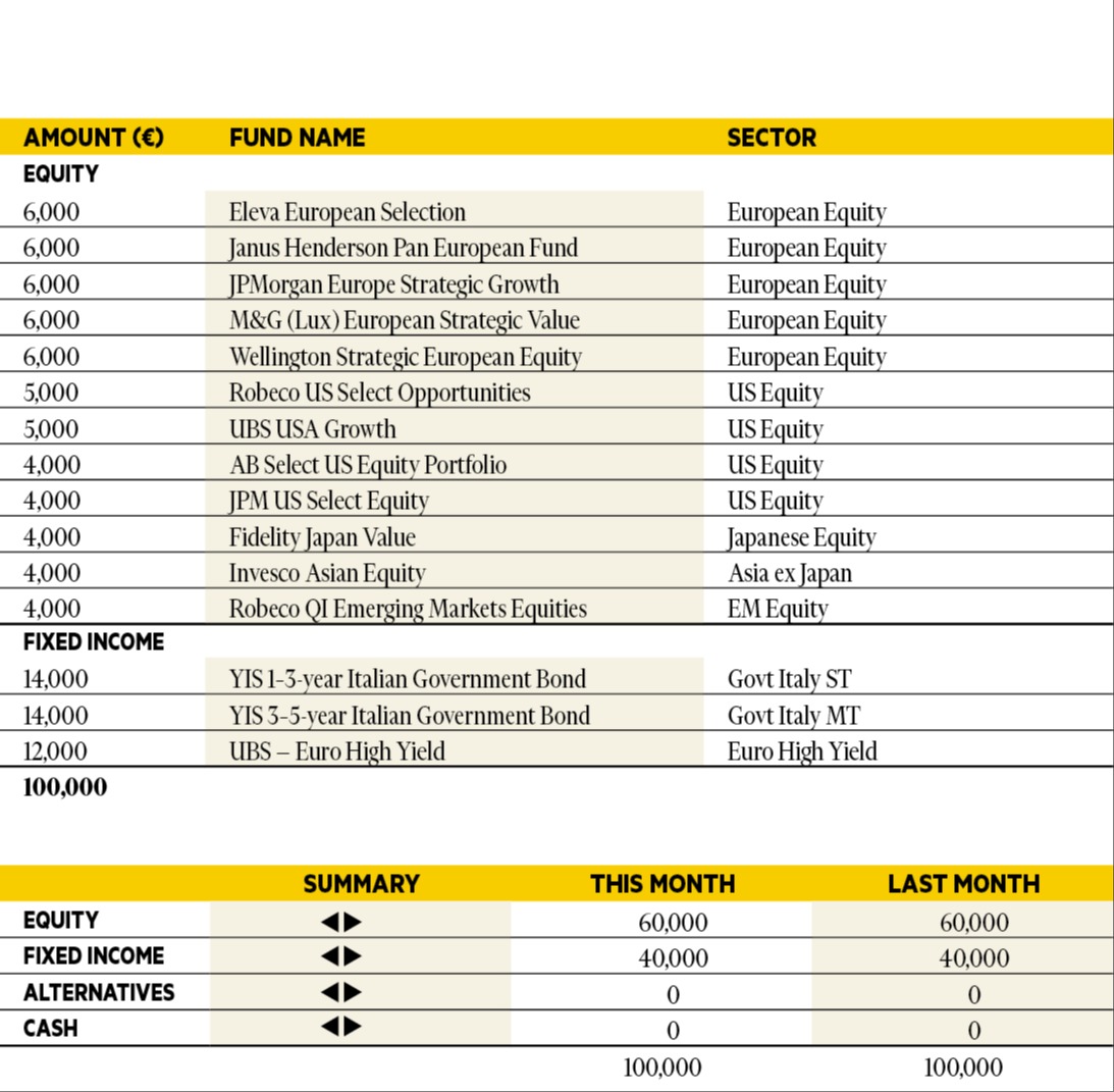 “In October the performance of the portfolio was positive once again. The US reporting season has been good so far — the US government shutdown is still an issue, but is not worrying markets that much, the US dollar is strengthening, government bonds are posting gains alongside IG bonds, while on High Yield there is a bit more fatigue and returns are flattish. Emerging Markets are the standout winners this month. We keep our allocation unchanged, still favouring Italian Govies, Euro High Yield, a globally diversified equity exposure and some US dollar.”